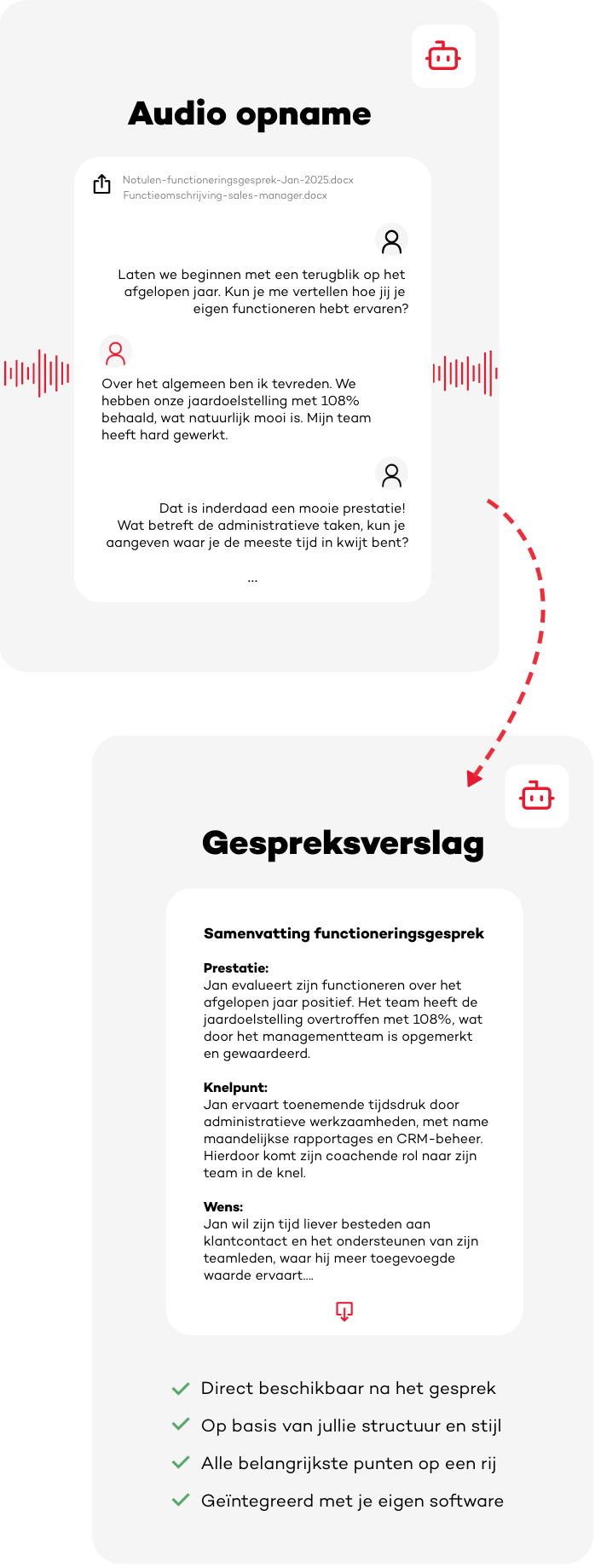 Maar minstens zo belangrijk: managers geven aan dat de gesprekken zelf beter verlopen omdat ze niet meer hoeven te noteren. De verslagen zijn completer en consistenter, waardoor je er echt iets mee kunt in plaats van dat ze ergens in een map verdwijnen.