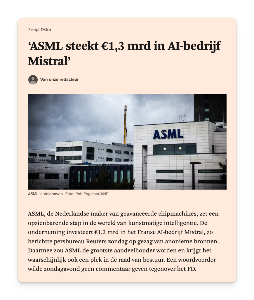 ASML investeert €1,3 miljard in Mistral AI en wordt daarmee de grootste aandeelhouder van Europa's meest waardevolle AI-bedrijf. CEO Christophe Fouquet zegt dat het puur zakelijk is: ASML wil Mistral's modellen gebruiken om hun chipmachines productiever te maken. Hun machines genereren 1 terabyte aan data per dag en wil graag een AI partner om die data veilig te houden.